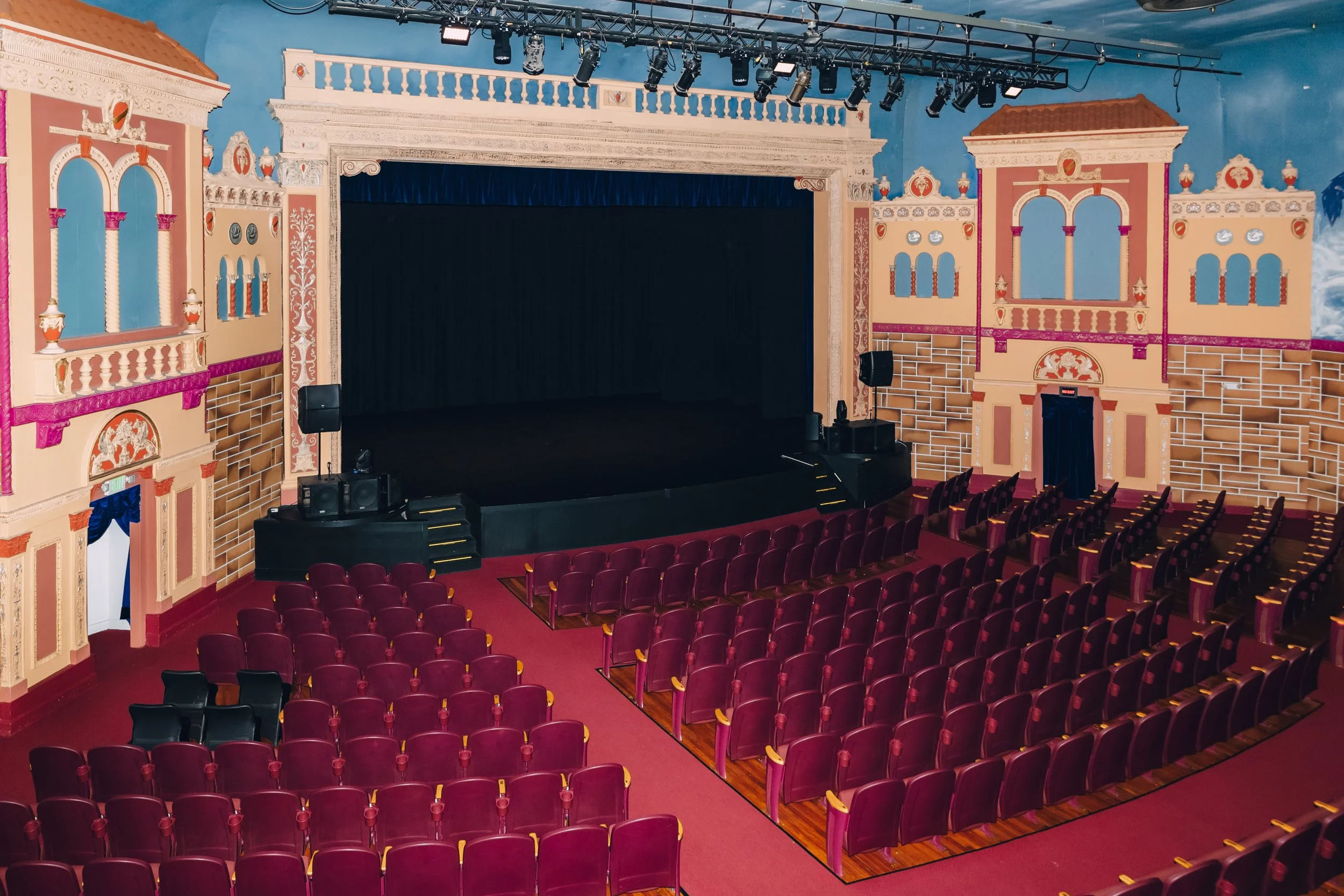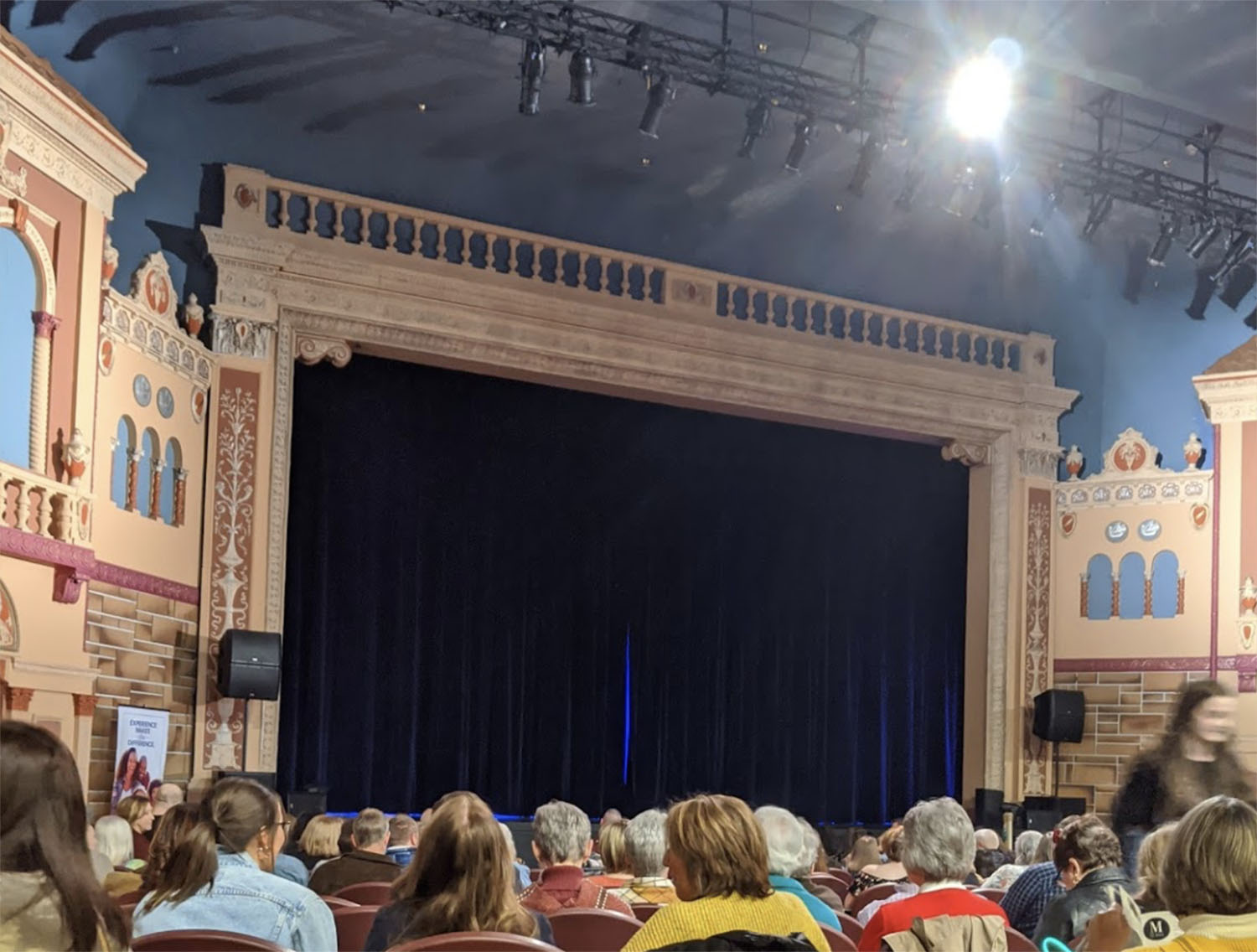 Sand dunes and palm trees graced the upper portion of the walls, the fire curtain featured the view from a castle in the Spanish countryside, and a cloud projector (located in the orchestra pit) cast moving clouds onto the auditorium ceiling, completing the picture.
