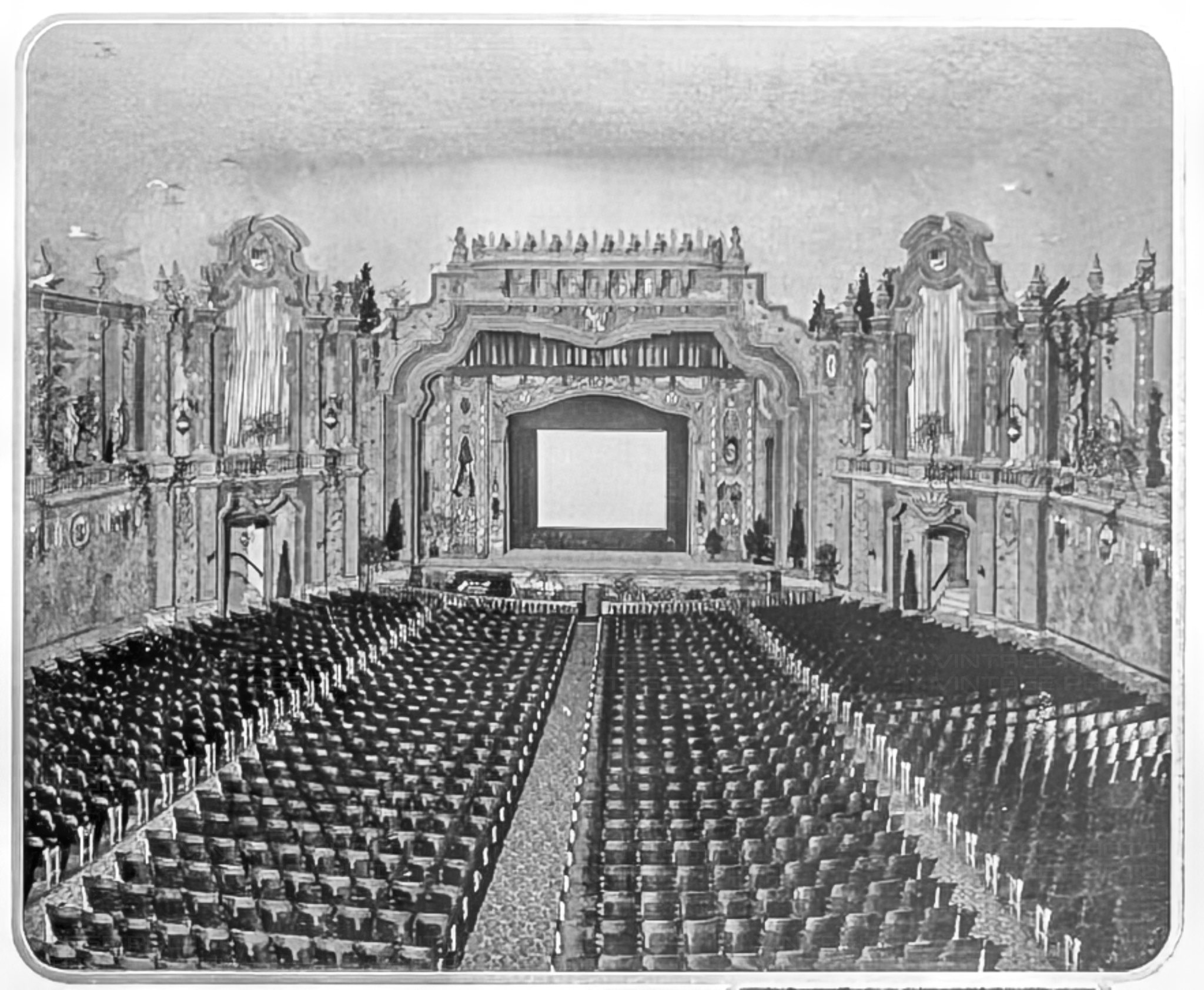 The theatre was designed by architect John Eberson in an Atmospheric style, with a Spanish castle theme. The theatre is notable for not having a balcony; quite different to most of Eberson’s other designs. The auditorium’s rear wall featured a double curved staircase wrapping around the projection booth and leading up to a grand promenade; all giving the impression of entering a grand Spanish castle.