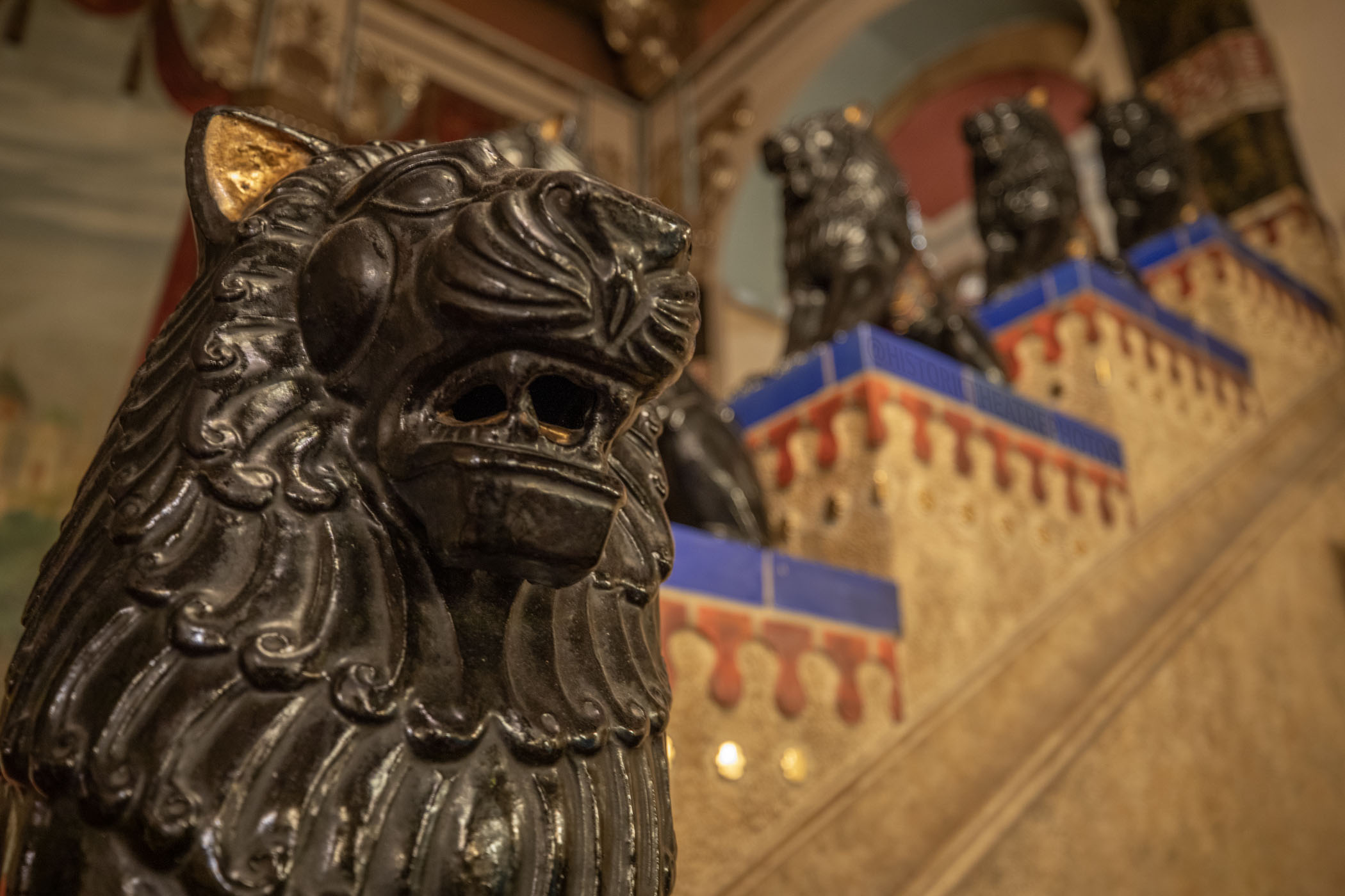 The huge lobby features three massive chandeliers. Murals on the walls include scenes featuring the Taj Mahal, and the staircase to the balcony is adorned with eight porcelain lions.