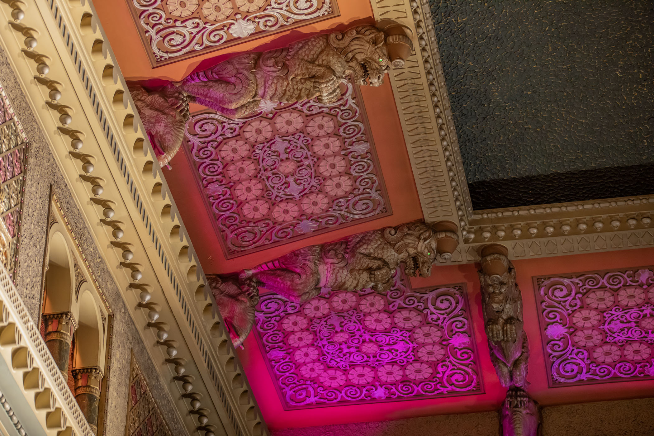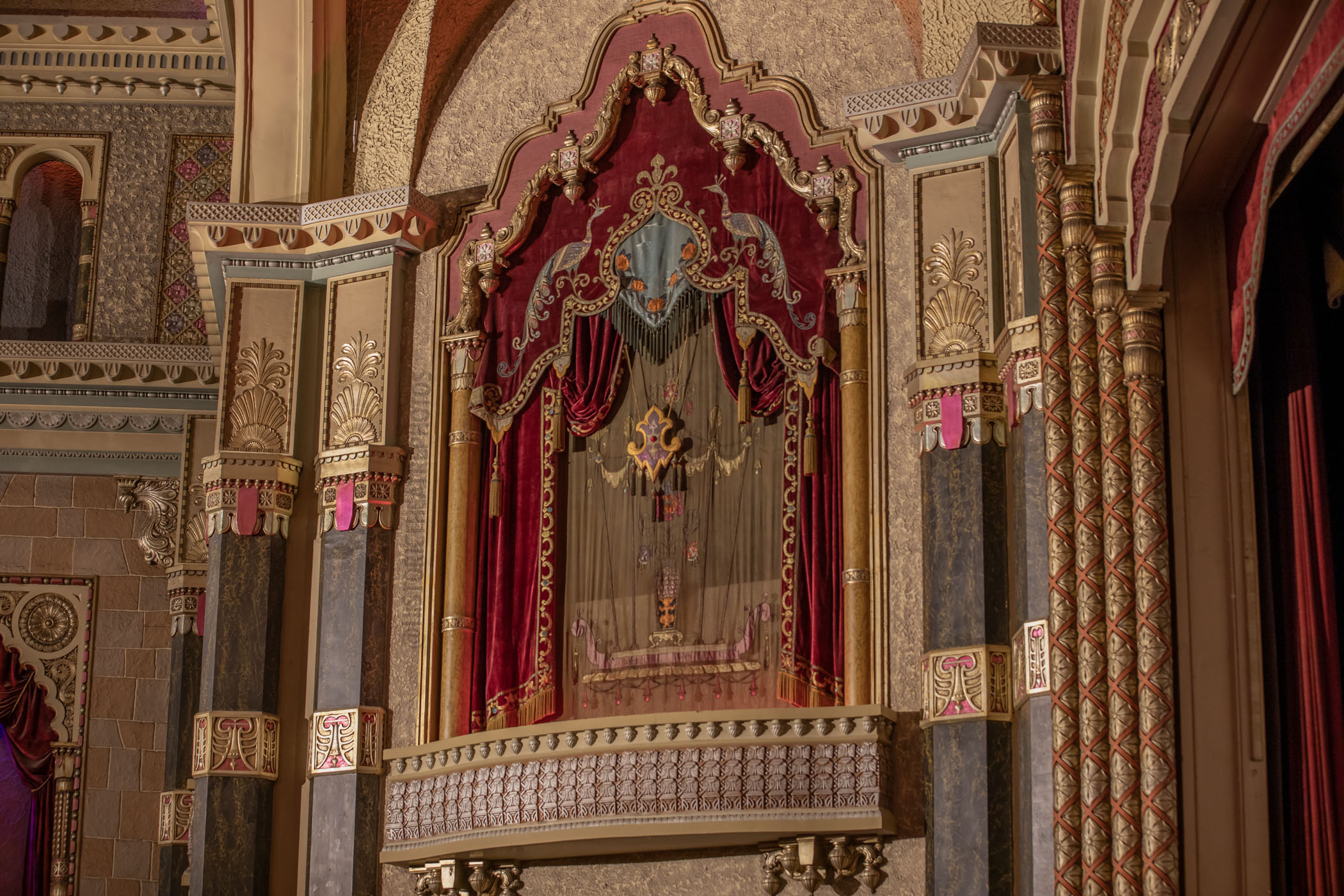 Milwaukee-based architect firm Dick & Bauer, comprised of architects Gustave A. Dick and Alex Bauer, designed the theatre with an East Indian theme that drew inspiration from Indian, Moorish, Islamic, and Byzantine styles. At the time of the theatre’s opening it was noted in the press that the auditorium featured “Buddhist idols, dragons, elephants and colored lights all blend[ing] into a mystic symphony of the Orient”.