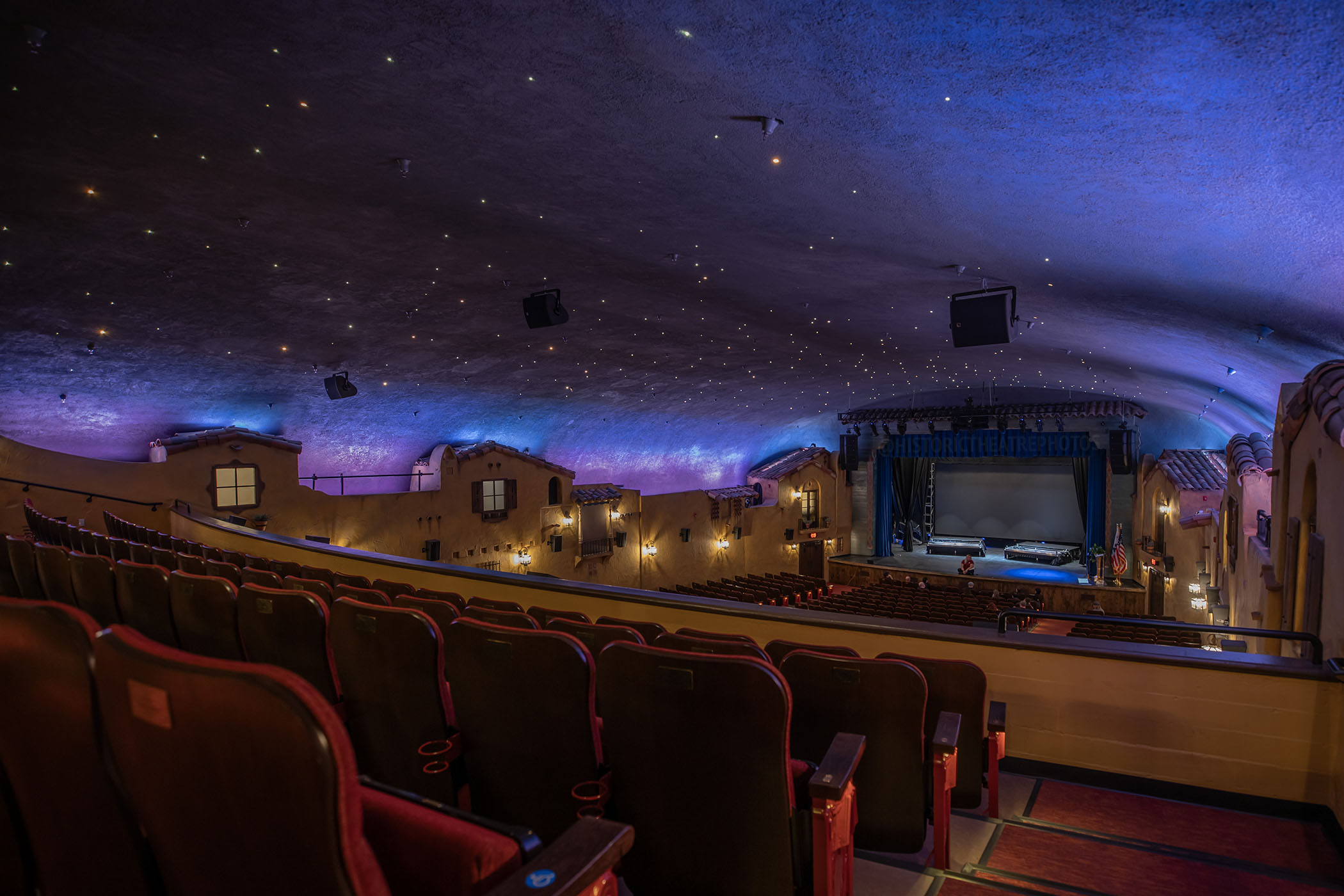 Detailed InformationThe auditorium features fanciful Spanish village façades carved into the side walls, and twinkling, star-like lights on the vast blue-sky ceiling.