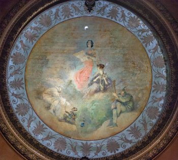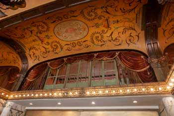 The auditorium is both elegant and intimate, no seat more than 80ft (23.4m) from the stage, finished in a French Renaissance style with subdued shades of gold, pink and blue/green. Paintings representative of vaudeville through the ages feature in the ceiling murals, and elaborate plasterwork surrounds the proscenium arch and surmounts the decoration on the flanking side walls. Lansburgh employed innovative recessed lighting to highlight the ceiling features which appeared to glow without obvious light source.
