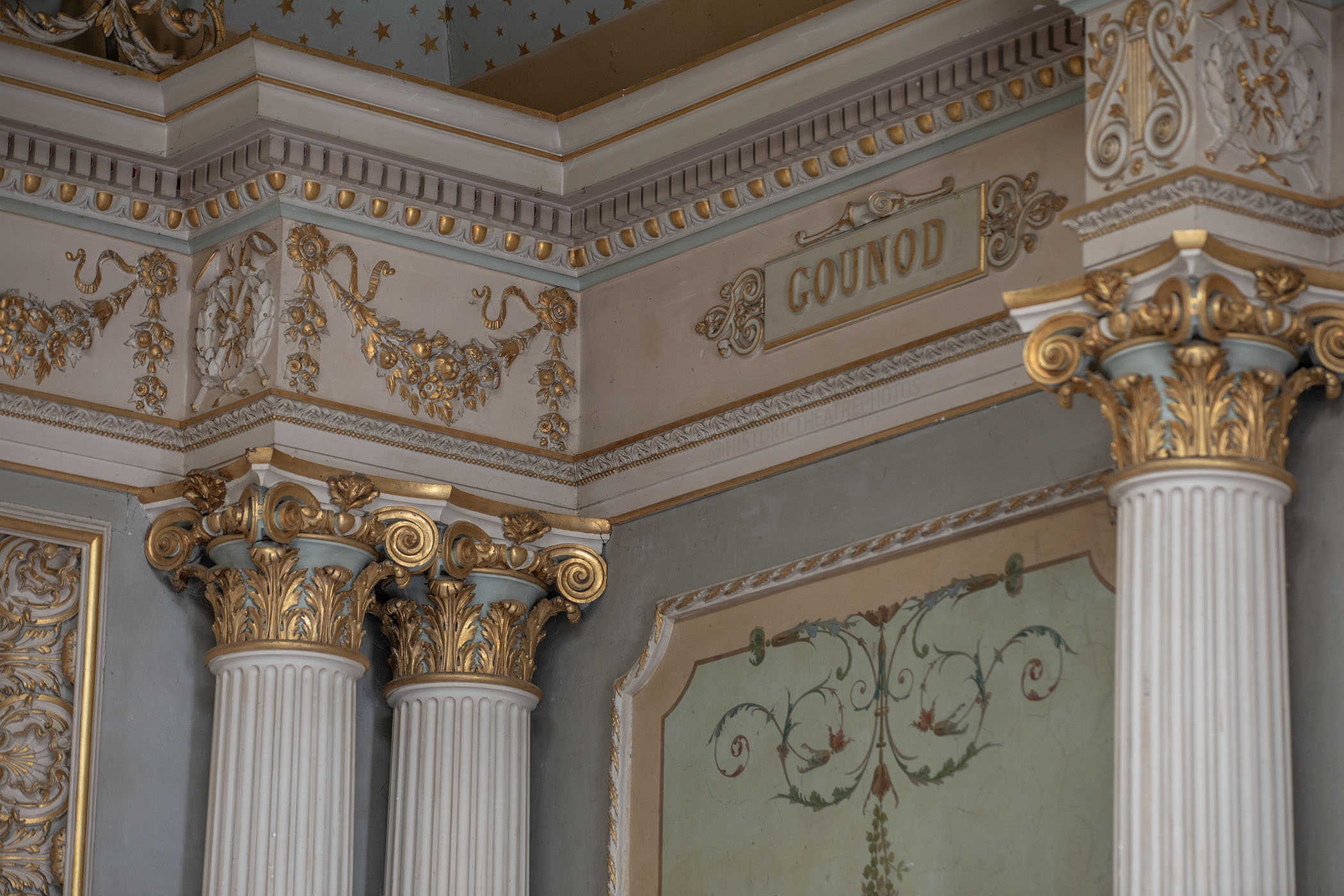 The centerpiece of the auditorium features the name of Patti’s favorite composer, Rossini, surmounted by Madame Patti’s monogram. Around the walls of the auditorium are featured the names of other composers such as Mozart, Verdi, Auber, Gounod, Donizetti, and other composers of operas in which Madame Patti had sung.