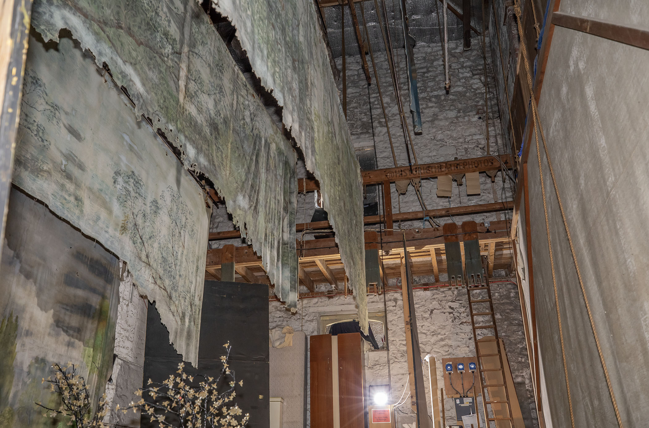 Under the stage, still in situ, are a number of cuts for bridges and sloats. These are likely the design features recommended by Henry Irving and were in line with the general design of UK theatre stages at the time, known as the English Wood Stage. All other understage machinery has been removed and the remining wood painted a light shade of grey, likely dating from the building’s conversion to a hospital in the early 1920s.