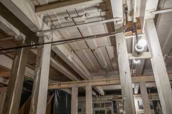 The theatre features a fly tower and working substage (now substantially cleared) following the English Wood Stage design featuring traps, cuts, bridges, and sloats. Original capstan mechanisms are still used to raise/lower the historic act drop and to open/close the blue swagged curtains (modern material but which somewhat mimics the original peacock blue silk swagged house curtain). Scenery is flown and secured using the original wooden grid and cleats along the rails of the fly floors at either side of the stage.