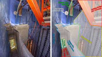 . Instead of being three-dimensional buildings like the rest of the Spanish village making up the auditorium’s interior, the additions were painted on flat surfaces with perspective and lighting techniques executed in paint making them appear three-dimensional. The new proscenium was set approximately 4ft in front of the original proscenium, and two-thirds of the 1931 “bridge” still exists (the top portion was demolished). Photos of the original proscenium in situ are included below.
