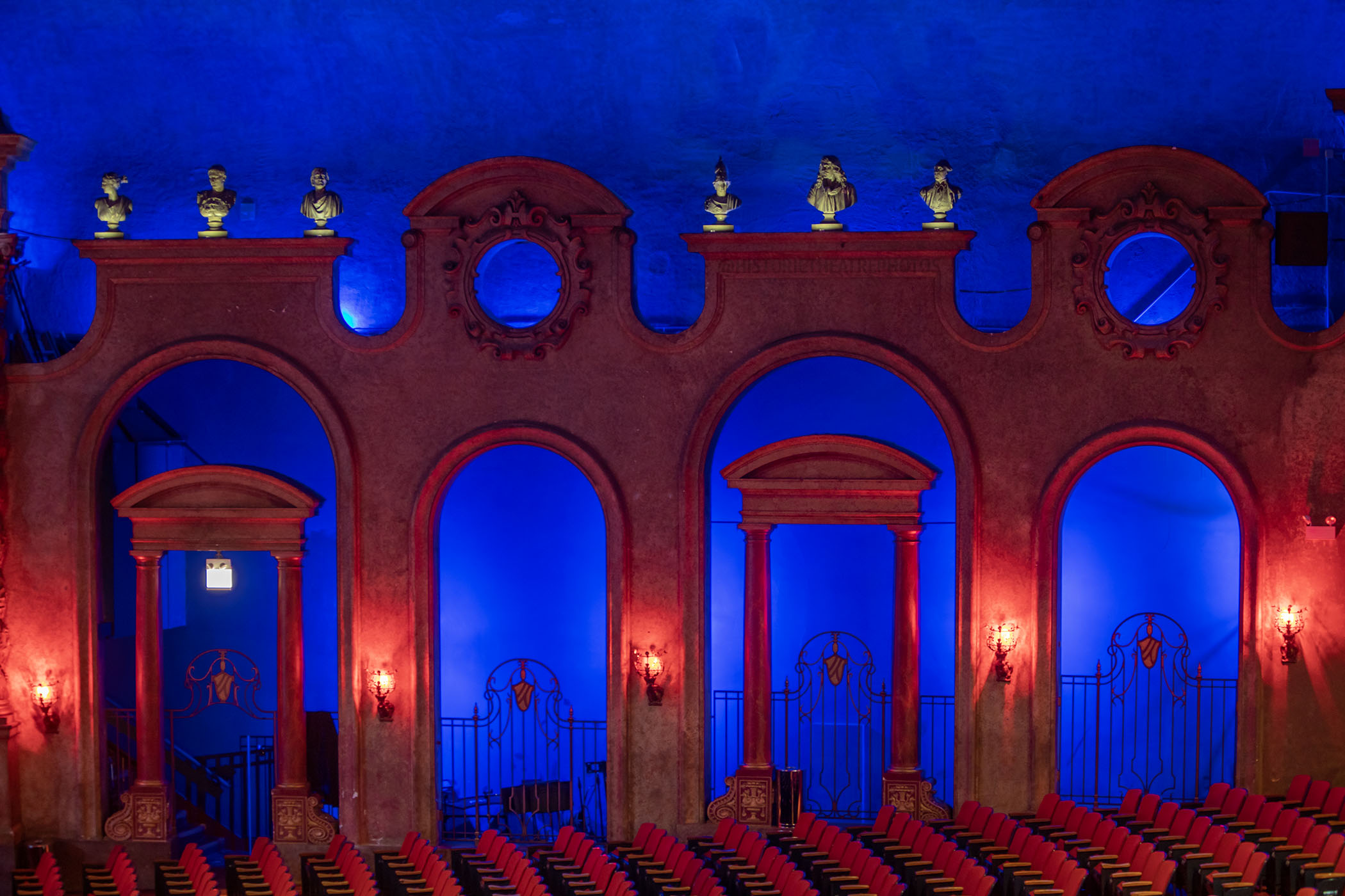 The theatre was built with a minimalist stage – just a few feet deep – with the option to build out a full stagehouse if the new “talkies” did not take off. In later years a thrust stage was added.