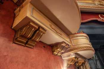 The number of balconies was reduced from three to two and seating capacity became a more manageable 2,000. Large promenades which had featured at either side of the auditorium were replaced with additional seating, and coupled with the wider proscenium arch made the auditorium feel vast compared with Matcham’s more vertically-scaled interior. The general decoration scheme was more subdued than Matcham’s flamboyant “Indian-Oriental” interior, but still managed to achieve a sense of grandeur in its scale. Two double-height boxes flank either side of the proscenium arch and provide a visual stepping-down from the line of the Dress Circle to the stage. The boxes feature three double sets of highly-decorated tapered columns appearing to support the tympanums above, with the line of the Upper Circle sweeping gracefully to the moldings at the base of the tympanums and expertly connecting the two together.