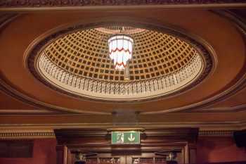 Although the Upper Circle is set well-back, it does not feel that way for patrons because of the false windows and draperies flanking the side walls and “slips” seating, drawing the eye in towards the stage. Access to both the Dress Circle and Upper Circle is from two levels, and it is one of the few venues in Edinburgh to feature vomitories to achieve this. The large proscenium sounding board is not overly elaborate and is split into panels distinguished with silver filigree moldings. A circular floral device provides the sounding board’s central decoration, and below it a flaming urn, or urn with sunburst, is the centerpiece of the proscenium arch. The auditorium ceiling is split up into simple square coffered panels, with a large central circular dome featuring a striking but non-original Art Deco chandelier.