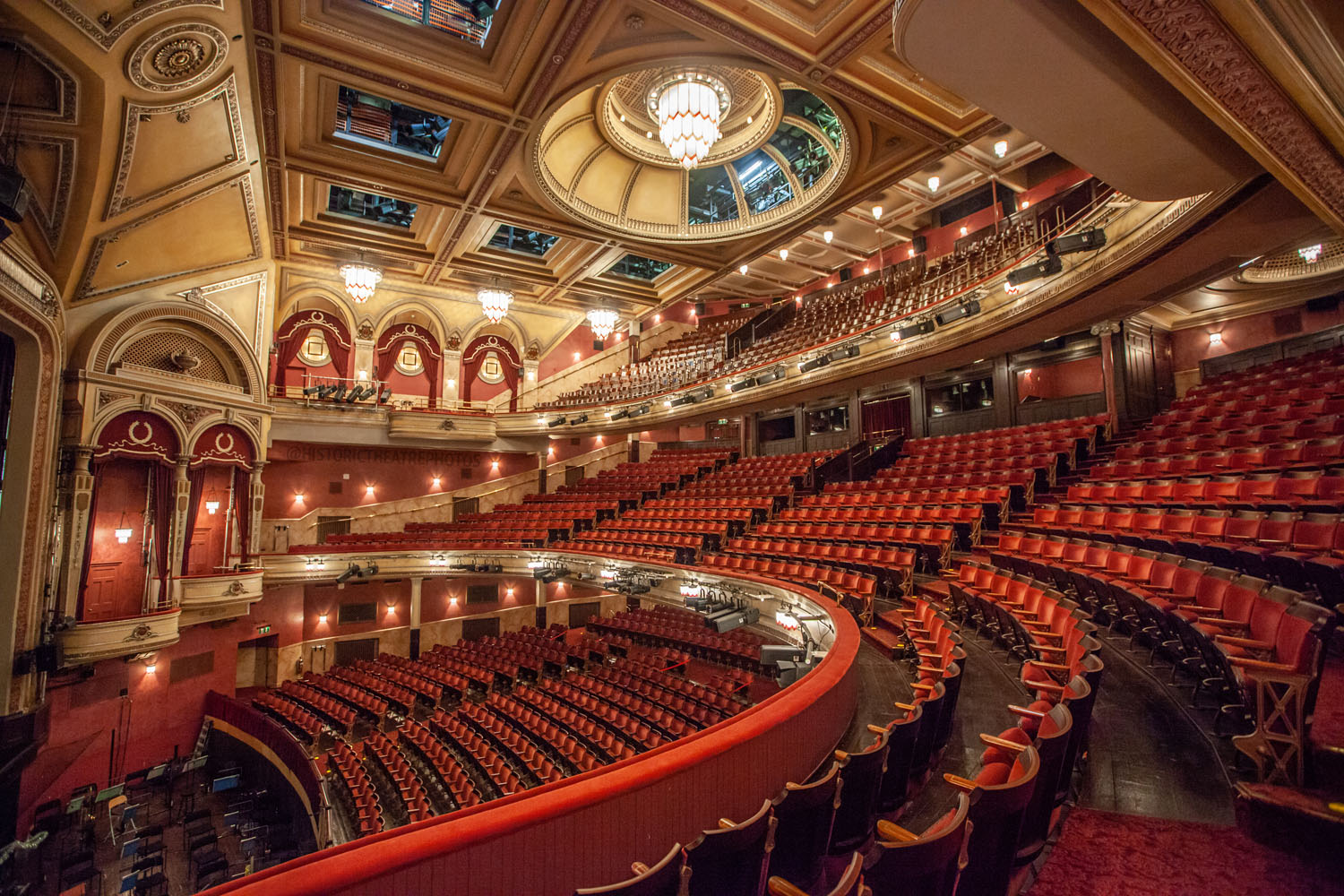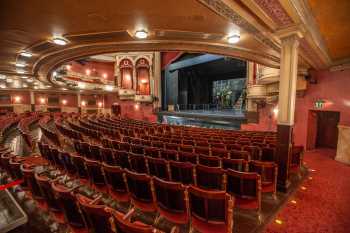 The Milburn brothers’ auditorium was renovated to a high level of detail and features a good number of restored 1928 theatre seats alongside replicas to make up the numbers. The color scheme devised for the auditorium was dark cream/light beige and crimson with silver and gold highlighting, using painting techniques such as glazed patinas to make the auditorium appear aged. Technical and Production/VIP viewing and control booths were added to the rear of the Dress Circle and a Followspot booth was added at the rear of the Upper Circle. Broadcast facilities were considered in the redevelopment and as such ample road power (and parking!) is available to the rear of the theatre for outside broadcast trucks, and flexible cableways provide plenty of options for routing heavy loads of temporary cables.