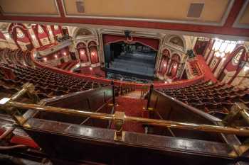 Non-concealed lighting positions were provided along both Dress Circle and Upper Circle balcony fronts, however an equal amount of lighting equipment is hidden in the auditorium ceiling: the rear four panels of the auditorium dome were removed to provide lighting positions, and the ceiling’s square coffered panels were also opened-up for lighting positions. The latter featured horizontal blinds, color-matched to the rest of the ceiling and designed to be closed until the start of a show to hide the lighting fixtures and not disrupt the appearance of the ceiling. Sadly these are not in regular use and have probably not been used since the theatre reopened in 1994.