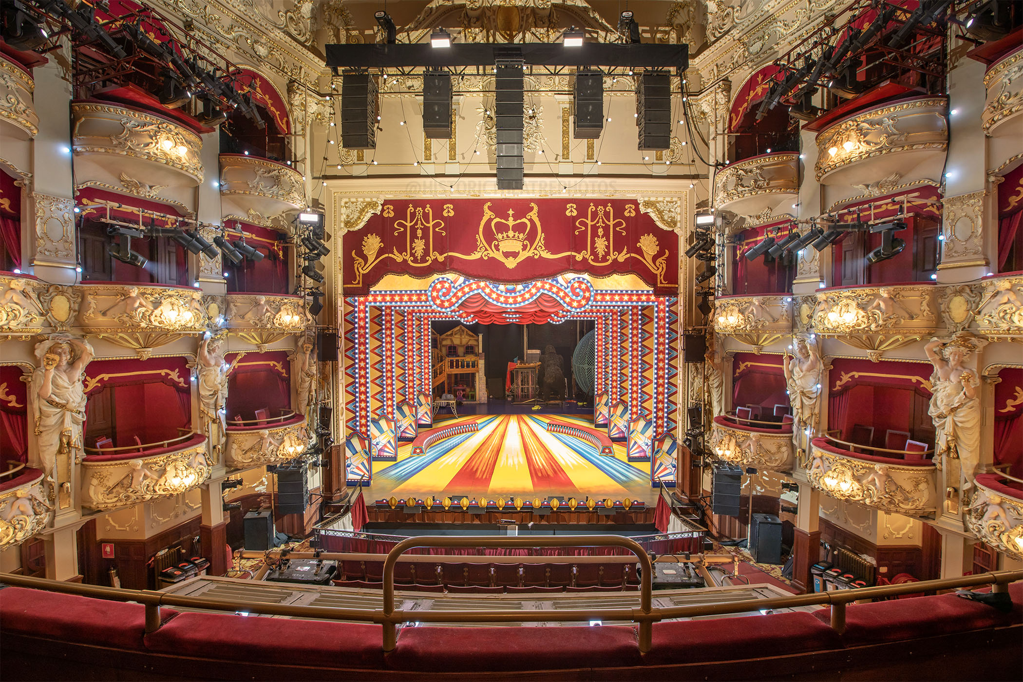 An enclosed box for stage lighting was added to the front of the Upper Circle (a feature commonly known as “auto bins”), extremely sympathetic to the theatre’s Viennese Baroque design, sometime after the 1950-51 revamp and prior to 1973. A similar but smaller box was added to the front of the Grand Circle at a later date.