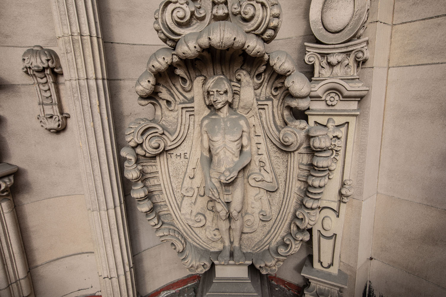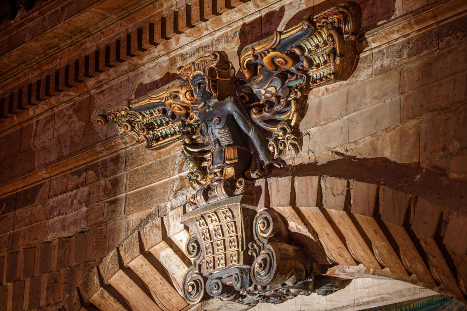 The façade features eight Muses of the Arts along with symbols of Western Americana such as bison heads, eagles, and longhorn steer skulls – all expertly sculpted by Joseph Mora. The entrance to the theatre, on Broadway, is highly decorated with deep moldings.