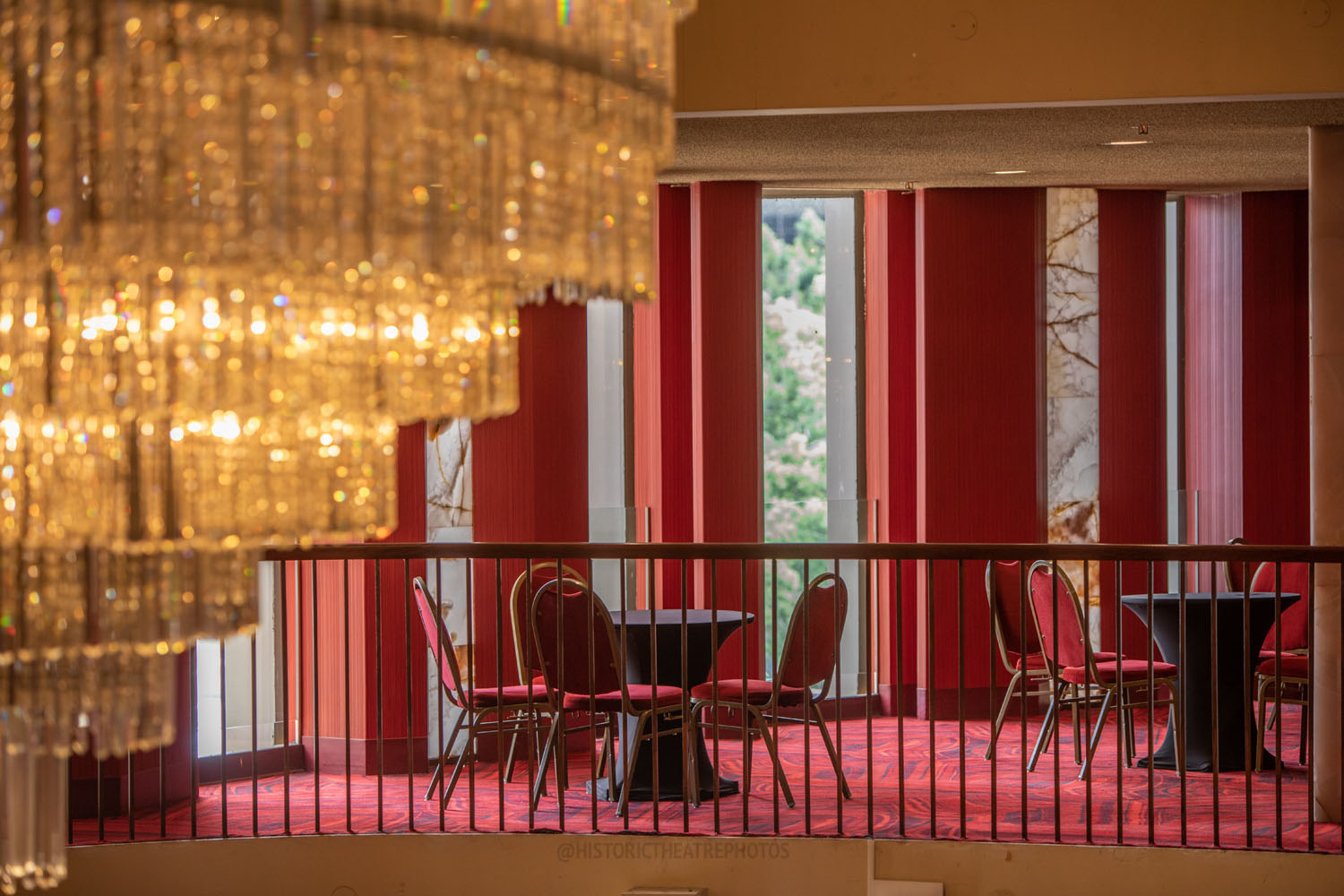 The focal point of the Front-of-House facilities is the Grand Salon which spans three stories from main floor level to the Balcony. The Grand Salon’s main feature is its large central chandelier. The chandelier is not original, with funds for its purchase having been raised soon after the theatre opened. The chandelier was installed in March 1966, about one year after the theatre’s original opening. It is composed of 52,000 Bavarian crystals and weighs 2,800 pounds, measuring 15ft wide, 8ft wide, and 12ft high.
