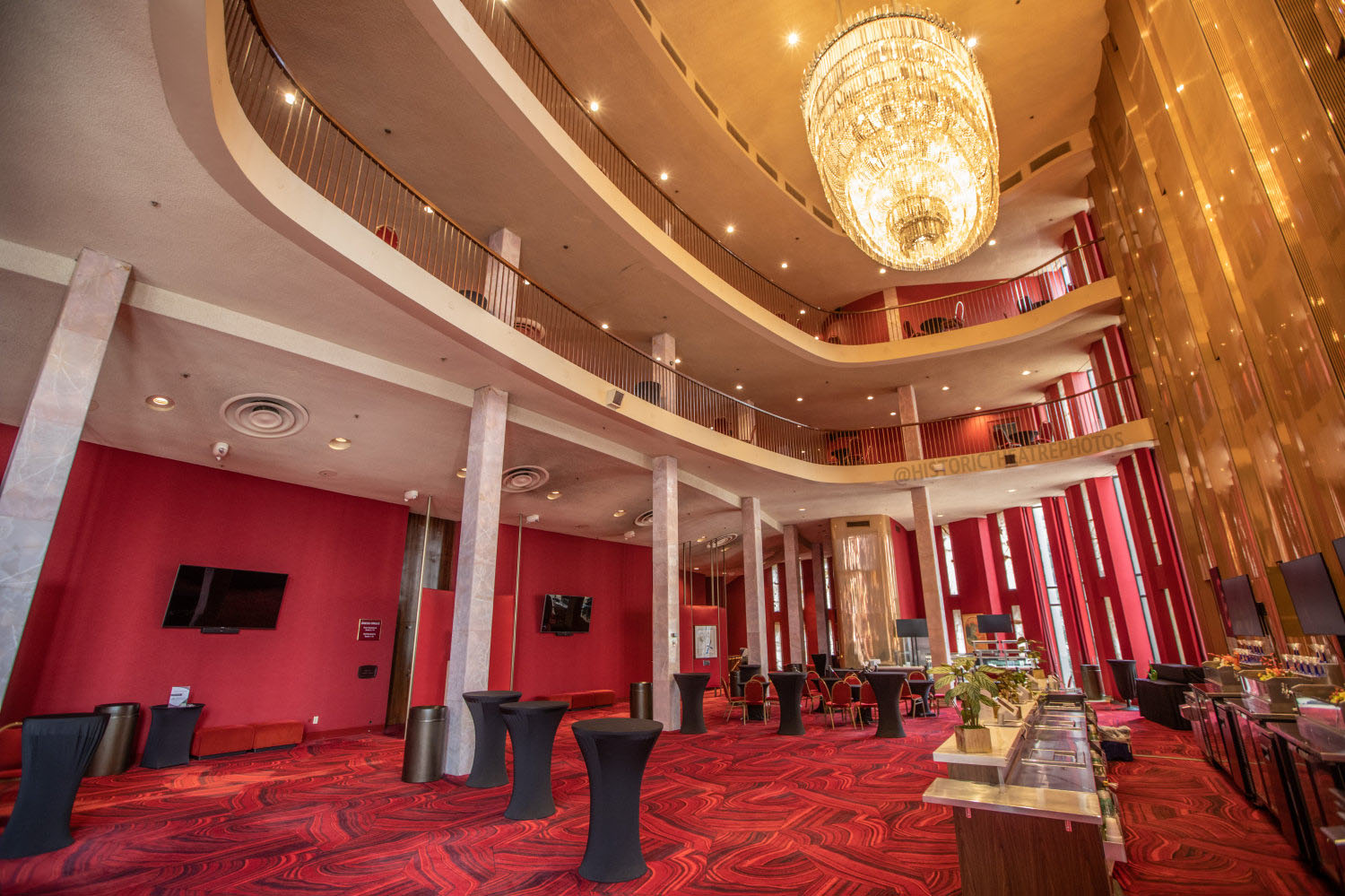 The theatre’s décor was originally described as “muted bronze and gold”, and modernist sculptures adorned the auditorium sidewalls – they have since been removed.