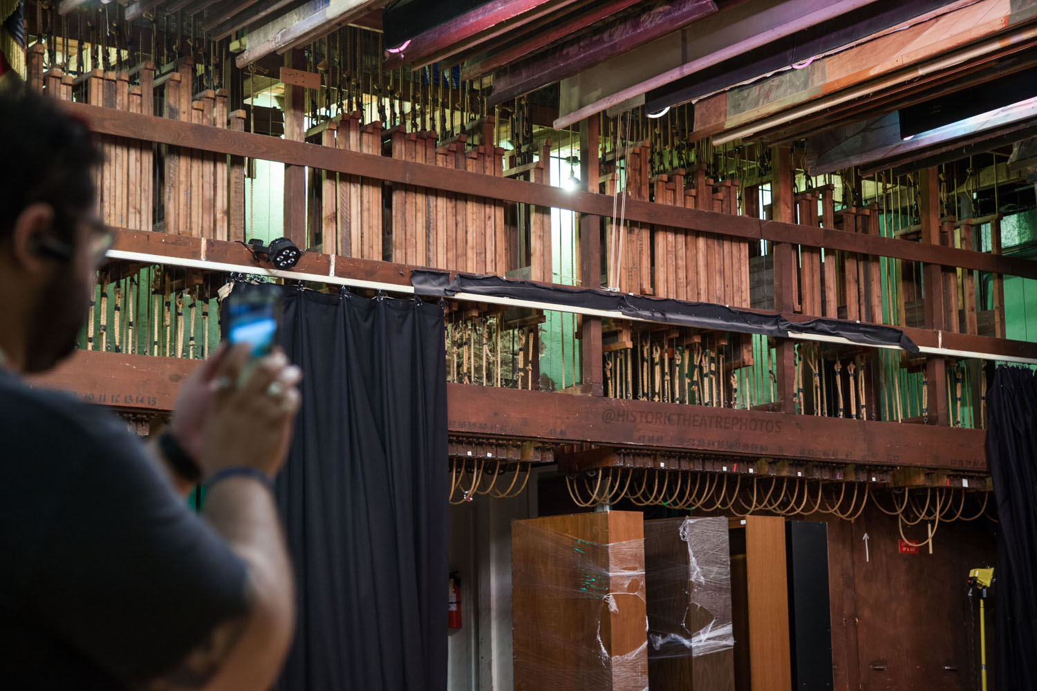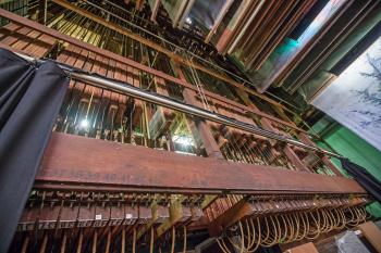 The theatre’s wooden grid was strengthened and a fly floor installed 12ft above the stage floor on Stage Right. The existing three levels of backstage catwalks were repaired for safety and improved access. The “Thunder Chute”, or “Thunder Run”, was also installed: “constructed of heavy wooden planks, the tilted chute was loaded with bowling balls – some say cannon balls – so as to roll slowly along the length of the building simulating rolling thunder, even hoof-beats”.