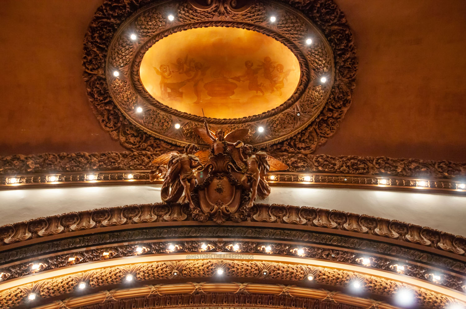 Double-height grand opera boxes step down from the first balcony toward the stage, drawing the eye toward the action. Atop the opera boxes are grouped allegorical sculptures by sculptor Charles C. Cristadoro.