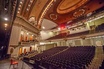 The auditorium is Baroque in style and features two balconies. The theatre’s main lobby, reached from the building entrance lobby (now called the Grand Lobby), provides access to all levels: main floor level (Orchestra), two stairs to the first balcony (originally called the Balcony and now called the Mezzanine), and a single stairway to the second balcony (originally called the Family Circle and Gallery and now called the Lower Balcony and Upper Balcony).