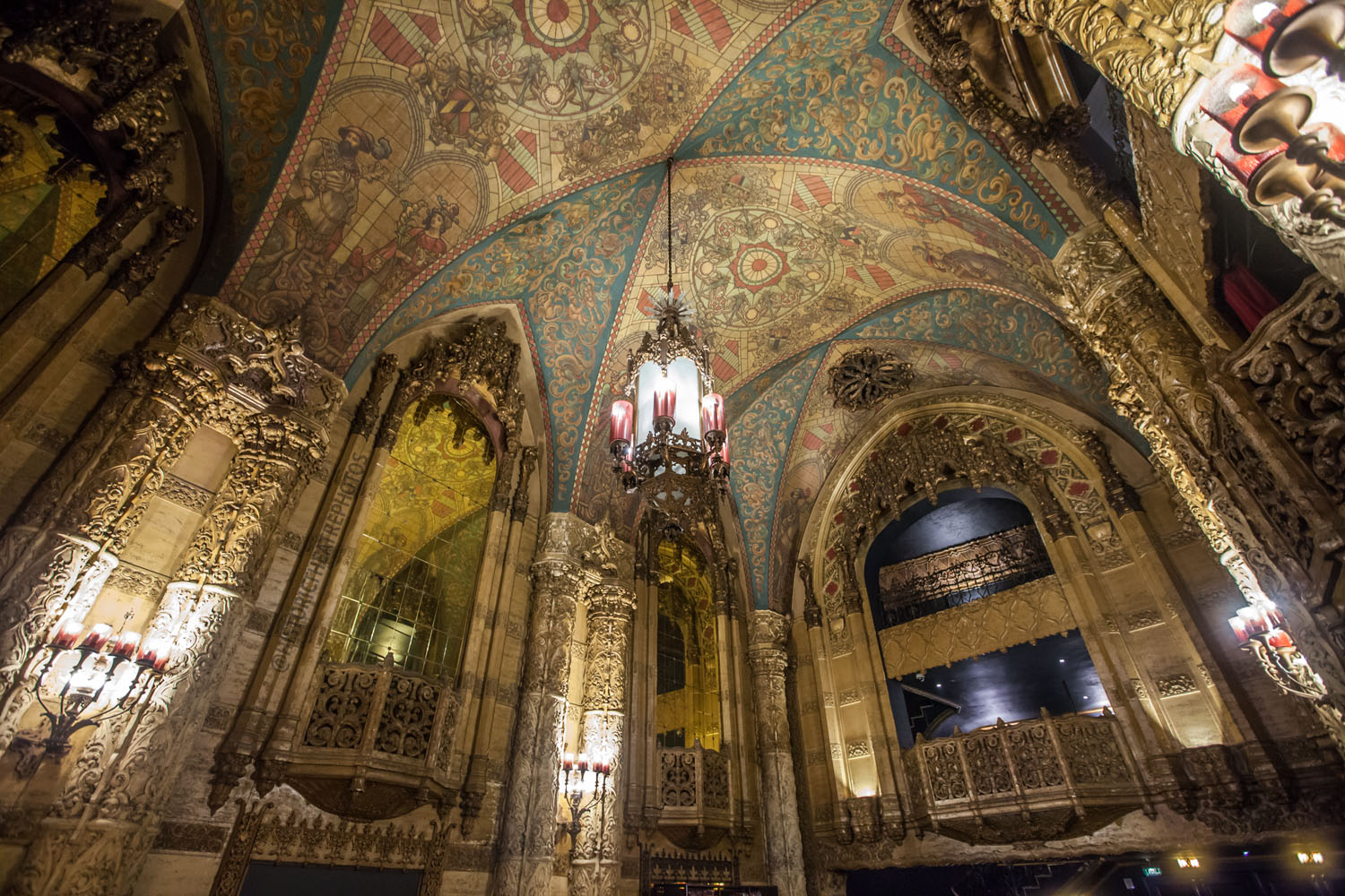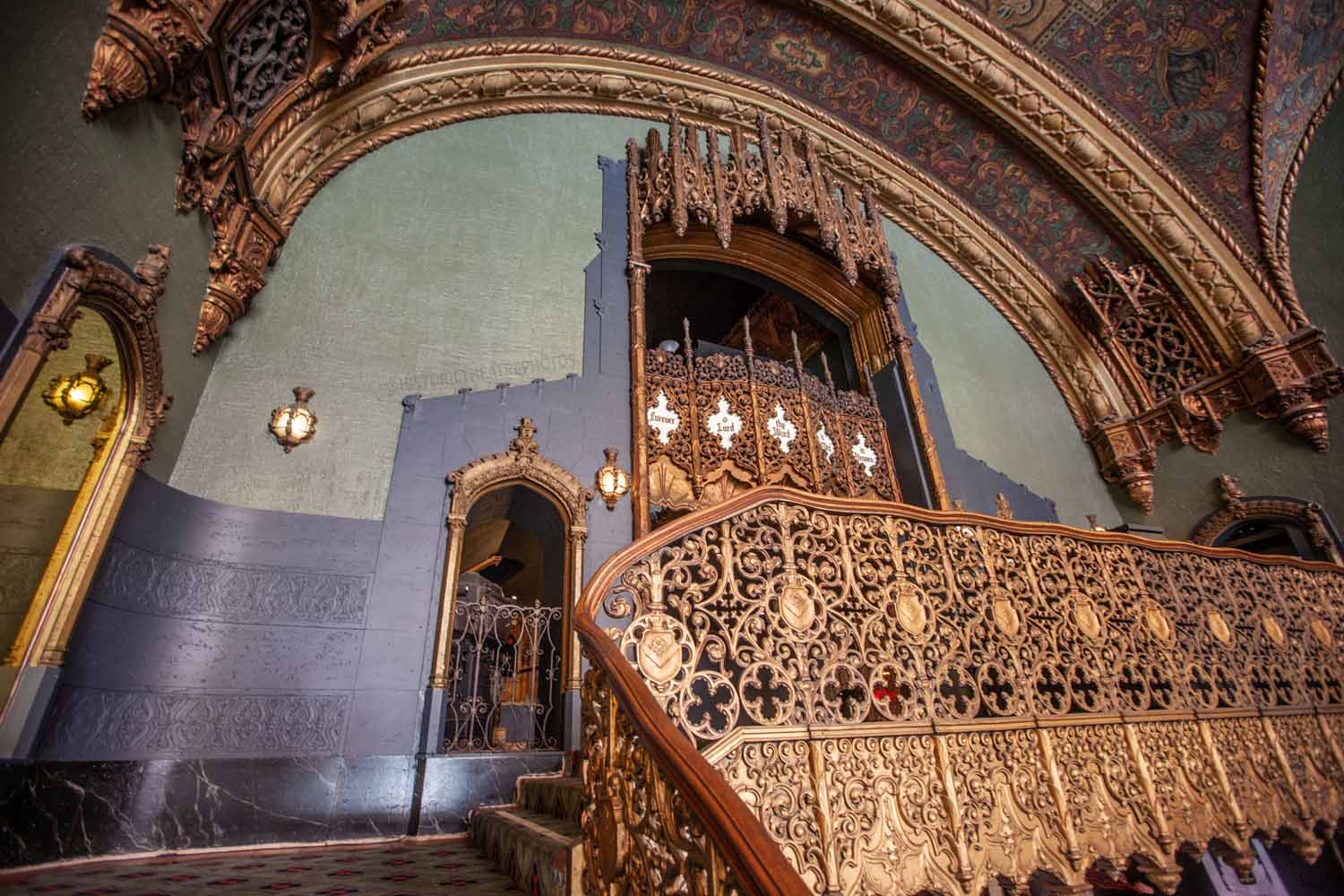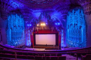 Within the auditorium, the heavily ornamented gothic organ grilles give way to fan-shaped ceiling brackets, with a large sunburst dominating the central ceiling. The sunburst dome, internally tiled with approximately 3,000 small disc-shaped mirrors augmented with 2,000 hanging glass pendants, is lit from behind the surrounding cove by hidden lights.